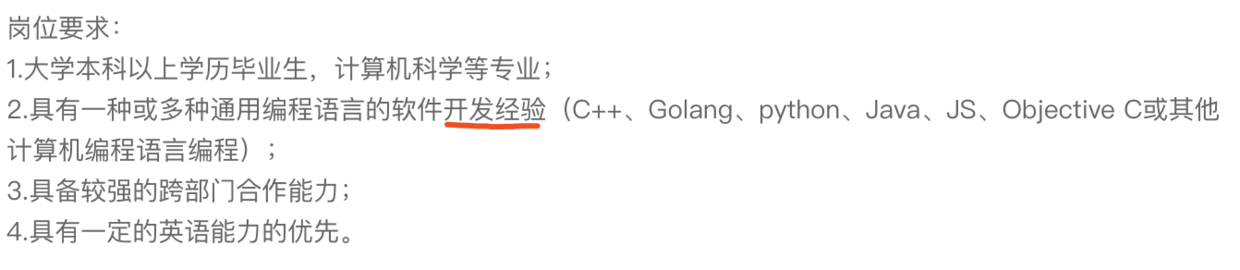 我隨手查閱了一些企業的校招要求,裏面明確要求要有一定的項目經驗。這就意味着如果沒有項目經驗,就無法找到工作;找不到工作,就不會有項目經驗。好像是一個死結唉。