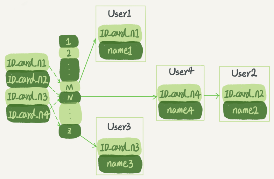 比如我們維護一張身份證信息和用戶姓名的表,需要根據身份證號查詢姓名,哈希索引大概是這樣的: