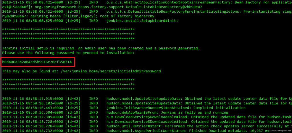 - 執行docker logs master,會在控制台显示jenkins的登錄秘鑰,如下圖紅框所示: