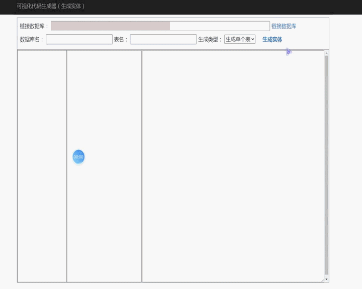 - 點擊表名,生成過的就显示生成的實體,沒有的則點擊【生成實體】按鈕生成(支持生成單表和數據庫表全部生成);