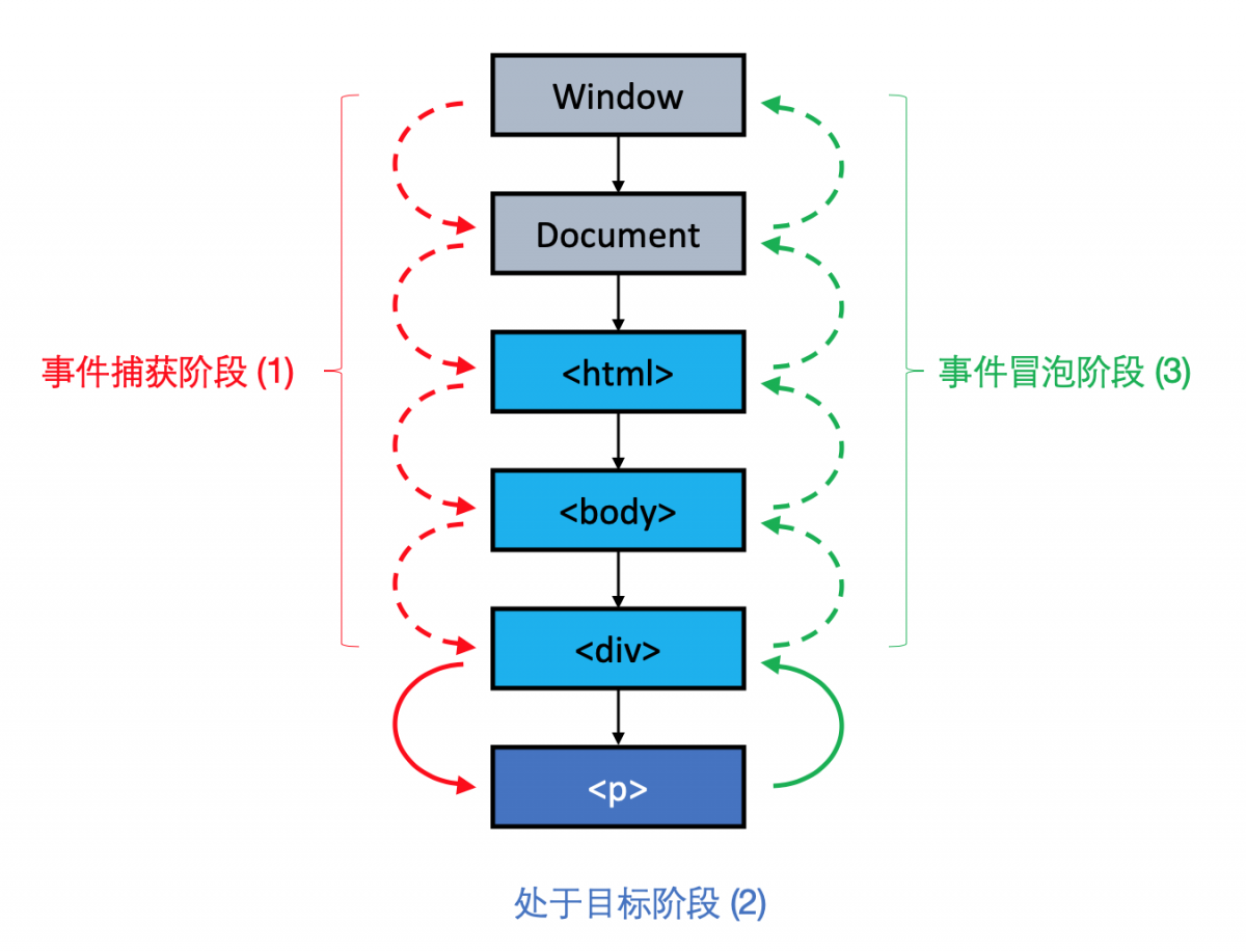 1. 觸發事件,開始 DOM 事件流,先後經過三個階段:事件捕獲階段、處於目標階段和事件冒泡階段