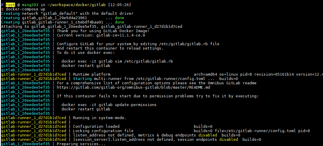 下面是運行效果,第一次運行會比較久,因為要拉取鏡像和初始化GitLab
