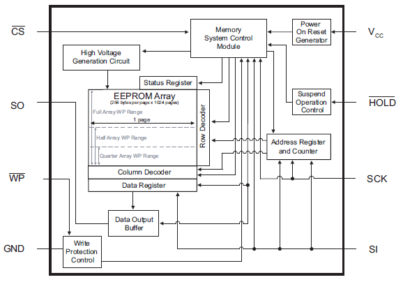 SPI EEPROM一般有8個腳,除去電源Vcc,地GND/Vss,以及SPI四根信號線(CS#, SCK, SI, SO)不言而喻之外,還有兩根特殊的控制信號,即WP#(寫保護)和HOLD#(掛起)。WP#信號主要是從硬件層面上對EEPROM內存進行保護,防止電路上的噪聲干擾篡改了EEPROM里的內容;而HOLD#則提供EEPROM寫操作暫停的功能,當該信號有效的時候,SI信號輸入將被忽略,因此主機可以做其他更高優先級的事情。