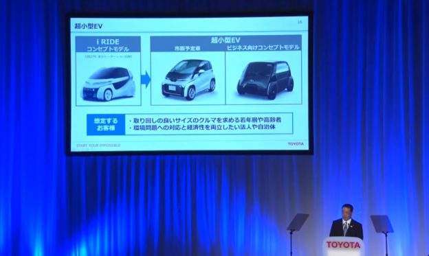 豐田尚未販售量產款 EV,目前計畫於 2020 年在中國開始生產小型 SUV 車「C-HR」版的 EV,之後計畫在 2020 年代前半(2025 年前)於全球開賣 10 款以上的 EV。