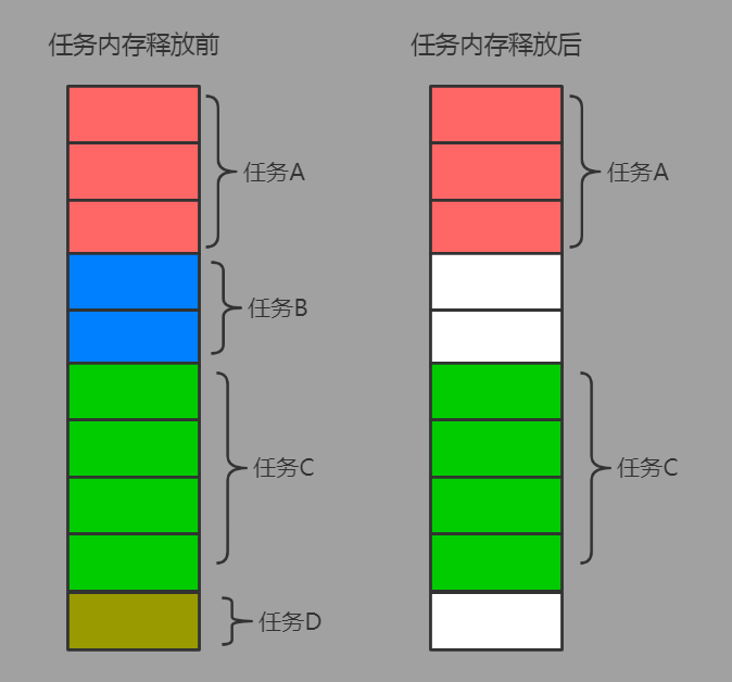 當任務B和任務D執行完成后,所佔用的內存空間被釋放,10MB的內存空間中出現了3MB大小的空閑內存。如果此時出現了一個任務E,需要為其分配3MB的內存空間,此時內存雖然存在3MB的內存空間,卻由於空閑內存的不連續,碎片化,導致無法直接分配給任務E使用。而這裏任務B、任務D結束后釋放的空餘內存空間就被視為外碎片。