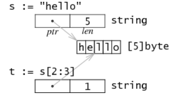 s是一個string類型的字符串,因為string類型不可變,對於多字符串共享同一個存儲數據是安全的。切分操作str[i:j]會得到一個新的2字長結構t,一個可能不同的但仍指向同一個字節序列(即上文說的存儲數據)的指針和長度數據。所以字符串切分不涉及內存分配或複製操作,其效率等同於傳遞下標。