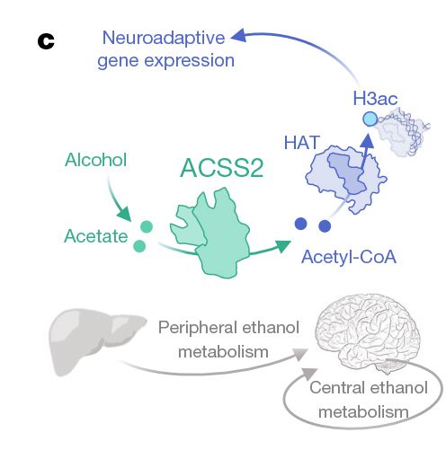 酒精和乙酸鹽在酶 ACSS2 的作用下,均能直接導致組蛋白的乙酰化,影響大腦基因的表達。