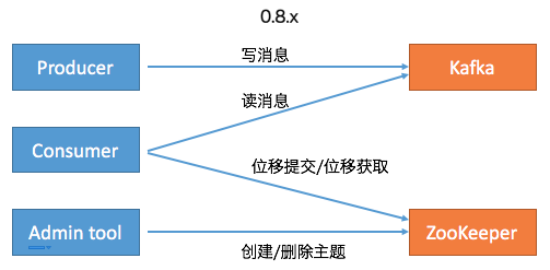 首先,社區committer給出了Kafka Java客戶端移除ZooKeeper依賴的演進過程。下面兩張圖總結了0.8.x版本和0.11.x版本(是否真的是從0.11版本開始的變化並不重要)及以後的功能變遷:在Kafka 0.8時代,Kafka有3個客戶端,分別是Producer、Consumer和Admin Tool。其中Producer負責向Kafka寫消息,Consumer負責從Kafka讀消息,而Admin Tool執行各種運維任務,比如創建或刪除主題等。其中Consumer的位移數據保存在ZooKeeper上,因此Consumer端的位移提交和位移獲取操作都需要訪問ZooKeeper。另外Admin Tool執行運維操作也要訪問ZooKeeper,比如在對應的ZooKeeper znode上創建一個臨時節點,然後由預定義的Watch觸發相應的處理邏輯。