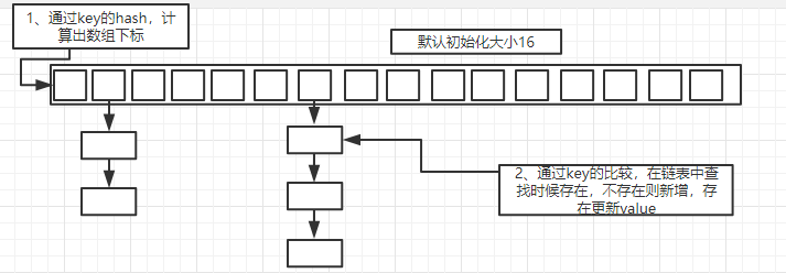 HashMap默認初始化size=16的哈希數組,然後通過計算待存儲的key的hash值,去計算得到哈希數組的下標值,然後放入鏈表中(新增節點或更新)。鏈表的存在即是解決hash衝突的。