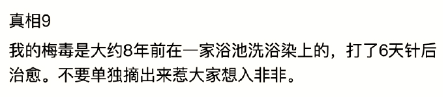 某知名企業創始人稱自己“在浴池洗浴感染梅毒,打了 6 天針后治癒”。